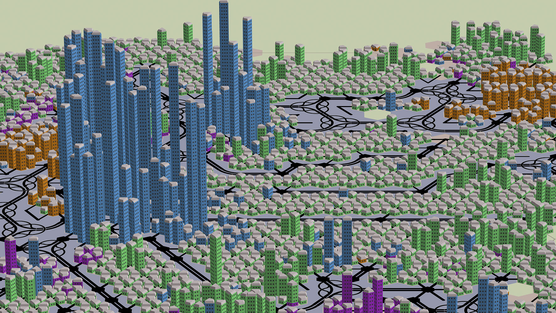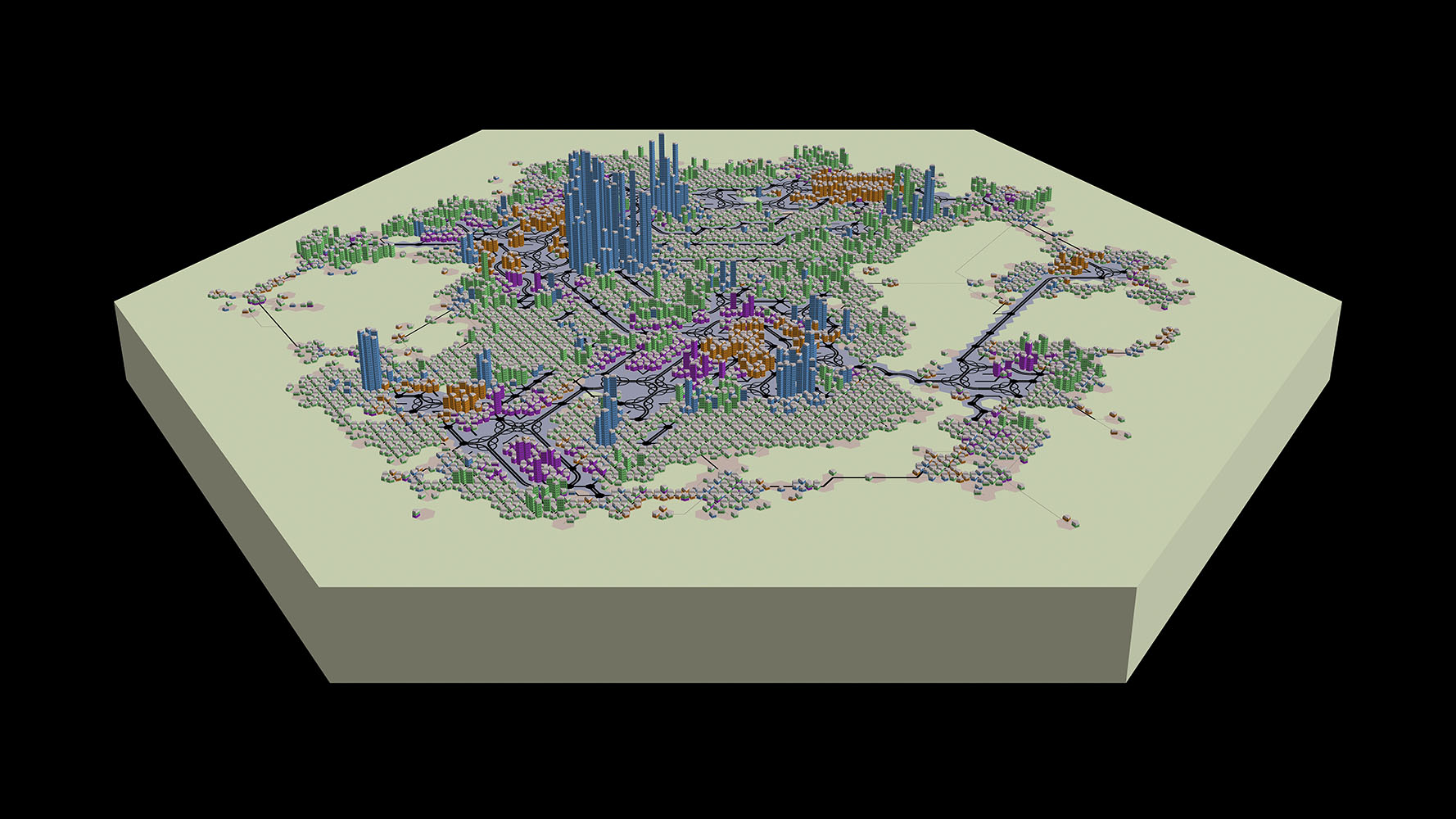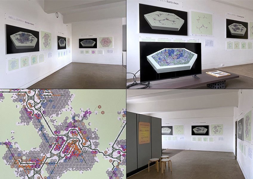 Real cities are shaped partly by individual decisions and partly by plans generated by authorities at the different levels of government. The Bellmorn installation exhibits five stages of development of a simulated city whose evolution is shaped entirely by individual decisions.