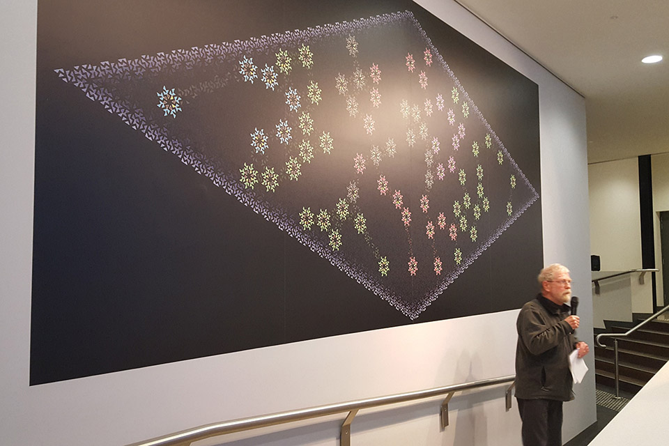 In making the work I wished to honour the individuality of those involved in the Eureka events, but also to represent in some way the greater forces, social and technological, that had these individuals in their grip. The main part of the work is a large abstract print based on a mathematical construction called an Ammann-Beenker tiling. This never repeats, but is not random; it is based on definite rules, but it is hard to see what they are; a metaphor for the larger pattern the individuals of Eureka were enmeshed in. I chose this specific pattern because it includes whole and fragmented eight-pointed stars. The Eureka flag, the central symbolic artefact of the rebellion, flown by the rebels at Eureka and now displayed at the Eureka Centre, has eight-pointed stars.