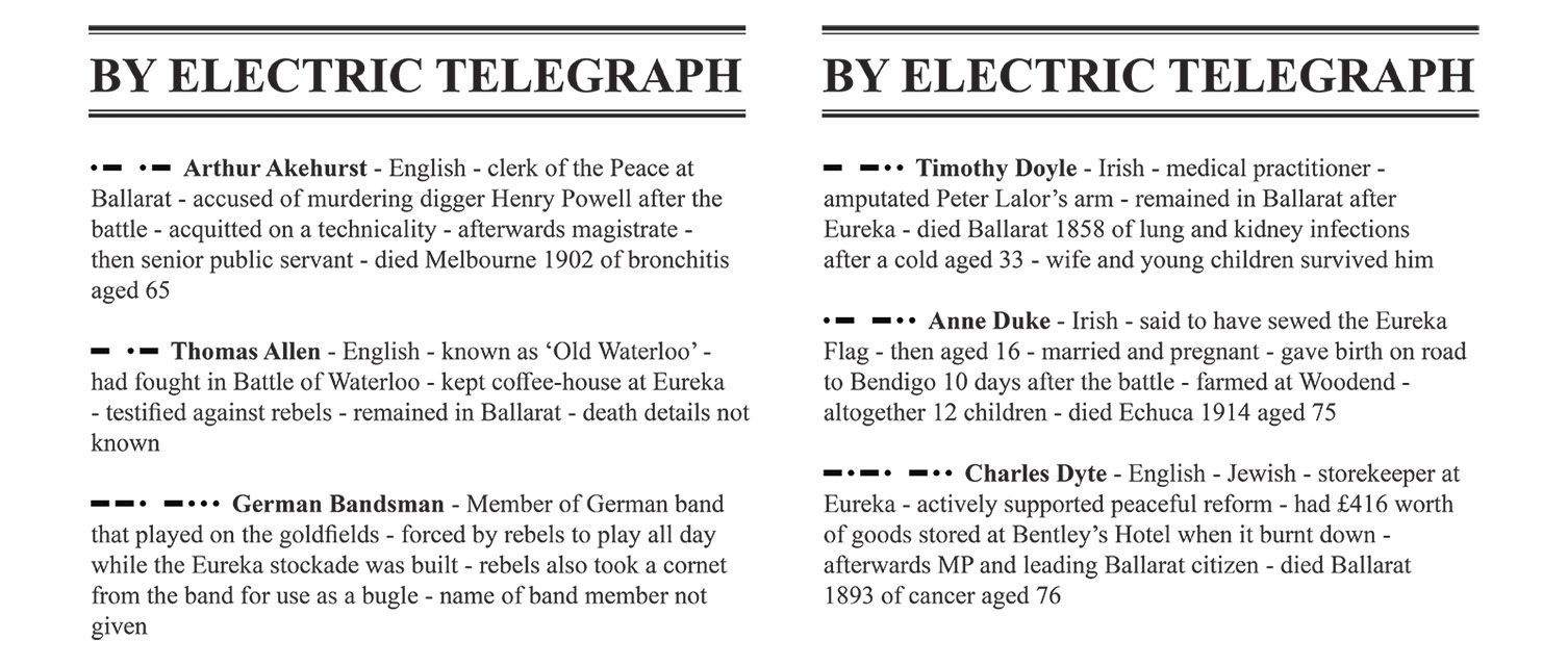 The discussion of the Eureka rebellion is always framed in terms of a social revolution; in introducing Morse code my intention is to draw attention also to the parallel technological revolution that was intertwined with the social revolution.