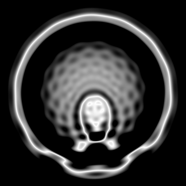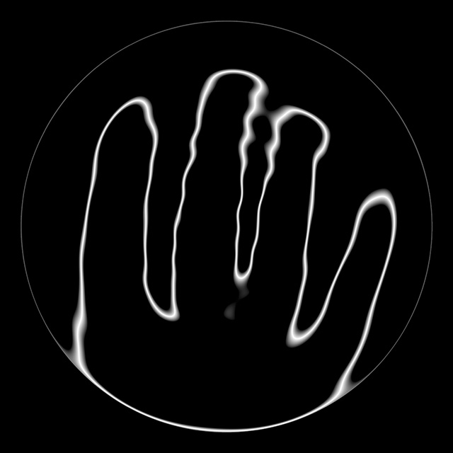Various small prints that are part of the Cloud Drum grouping of prints. Each print represents the response of a virtual drum to being struck with a virtual mallet. For some prints the mallet was a geometrical shape (circular or rectangular); for others it was obtained by a shadow cast during the operation of the Cloud Drum installation.