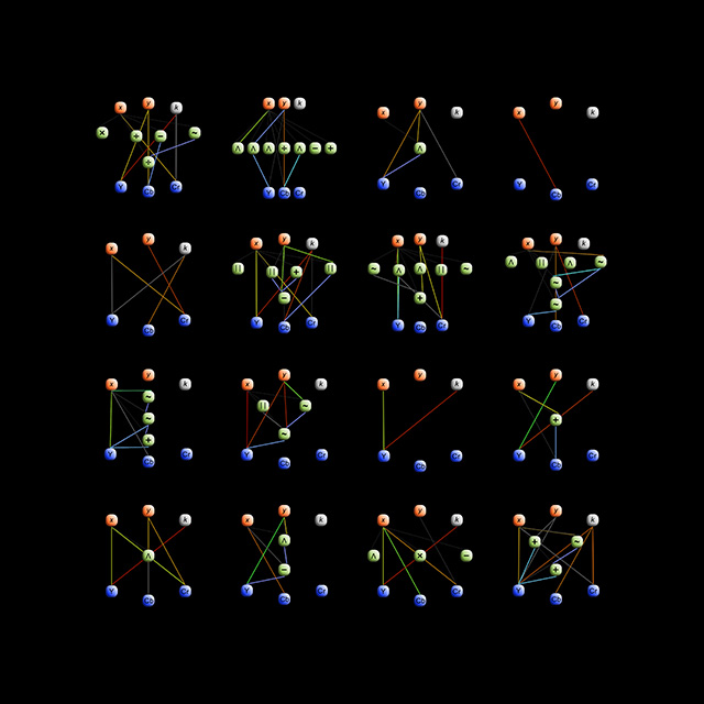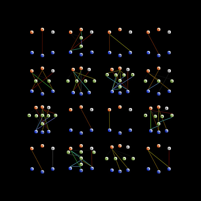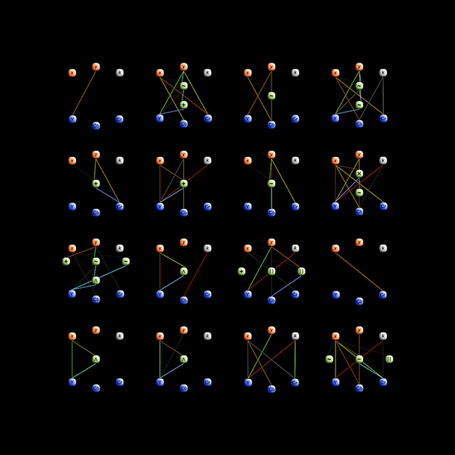 Pairs of digital prints showing a 4 x 4 array of patterns and the corresponding DNA, generated by the same computer program as the other Difference Engine prints.
