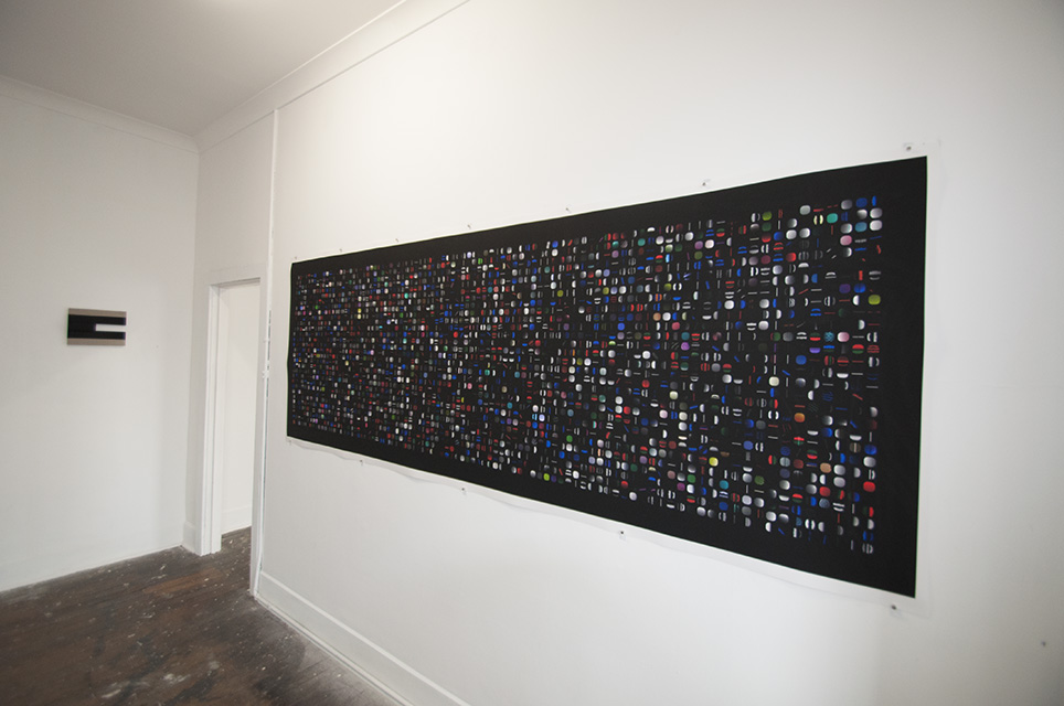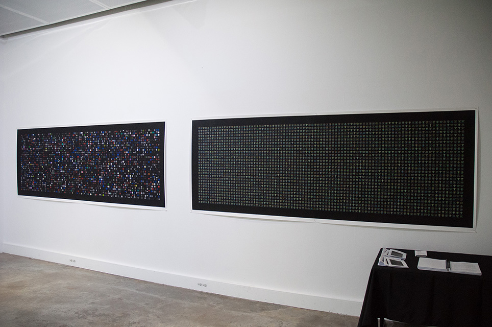 – Difference Engine 3. Shows 2,639 small patterns and their corresponding DNA. 100 x 300 cm. Edition of 3, 2012.