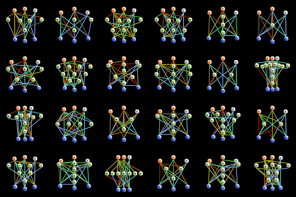 The large Difference Engine prints are part of the Difference Engine grouping of prints. This grouping of prints is related to the video Difference Engine: Genetic Crossfades.