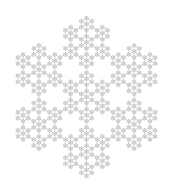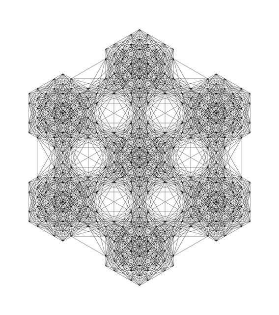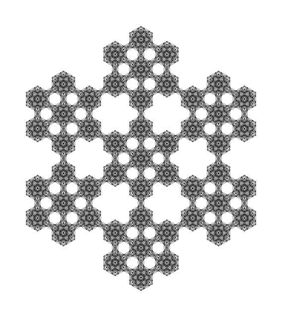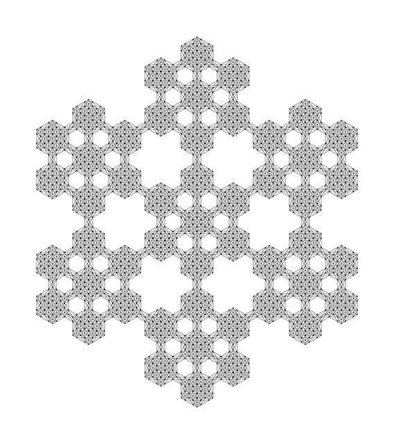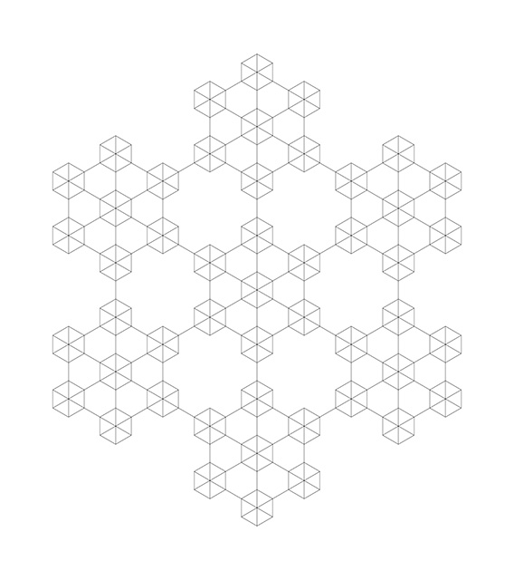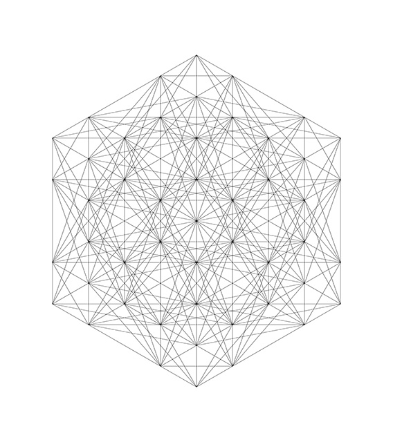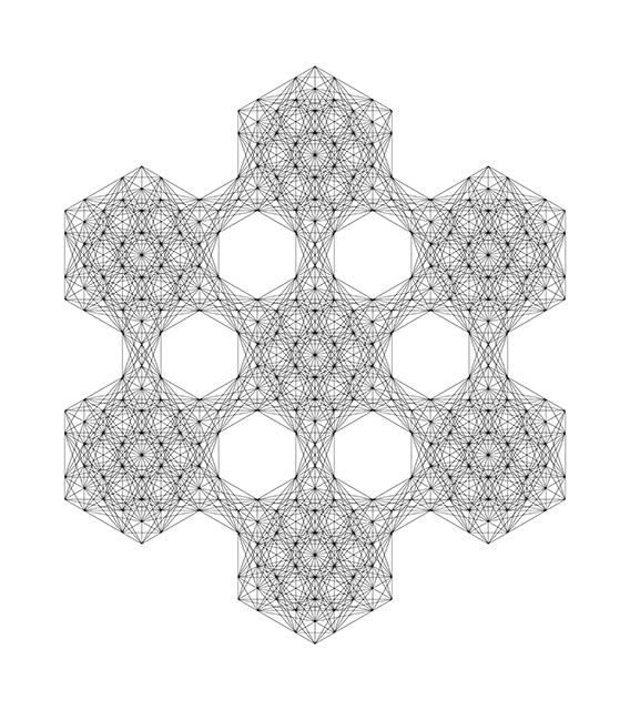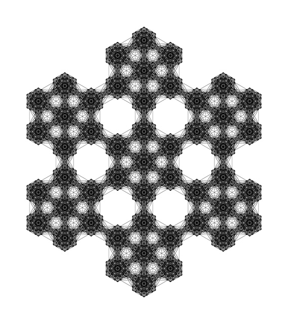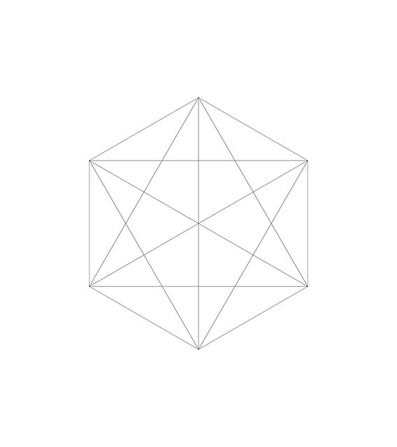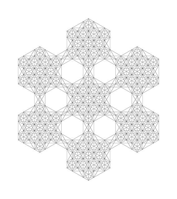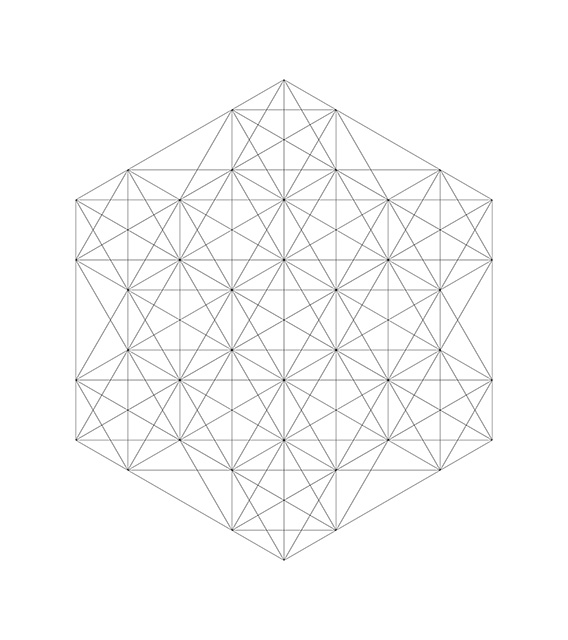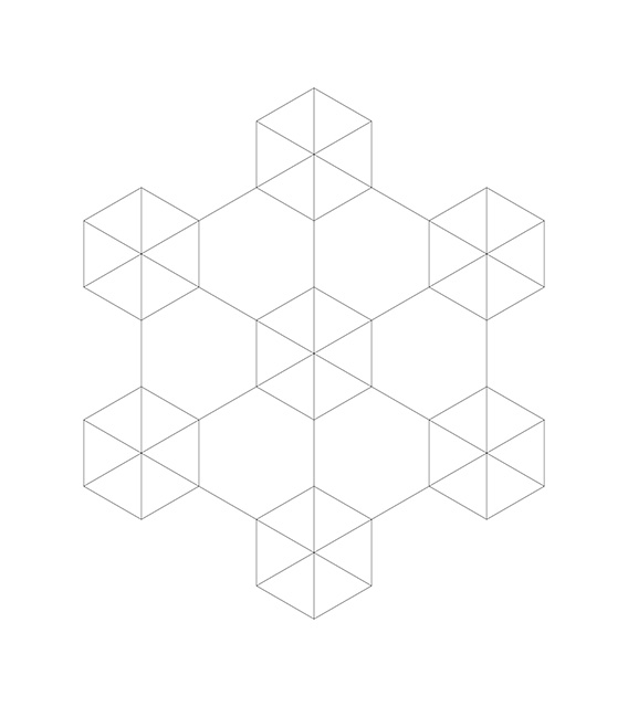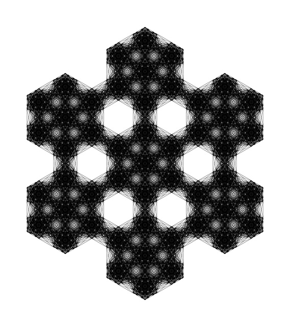 The Hexa: Proximity series of prints are made by taking hexagonal arrangements of points in specific patterns and joining nearby points. The complete set of 15 forms a triangular array, where the arrangement of points becomes more elaborated in each successive row, and the interpretation of "near by" becomes more generous moving from left to right. The series starts with Hexa: Proximity (1, 1), which consists of a single point.