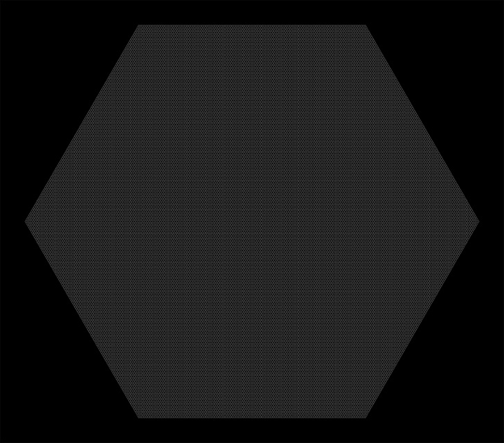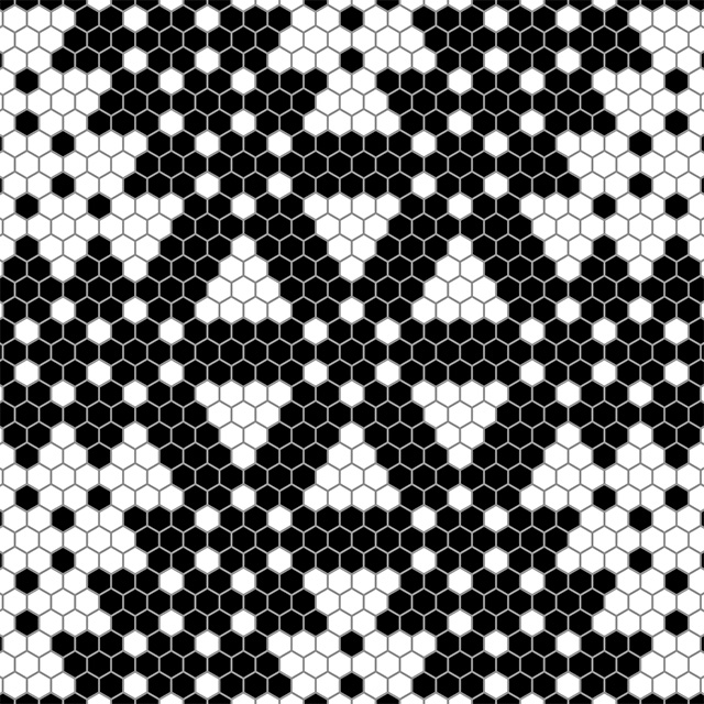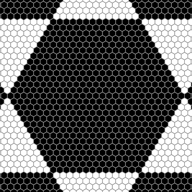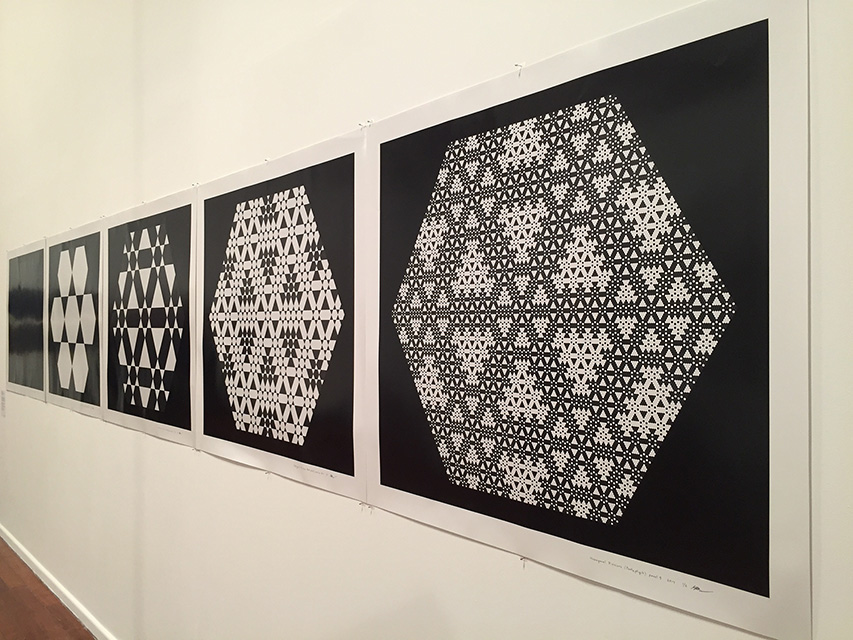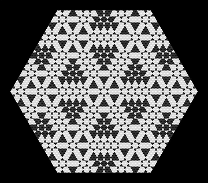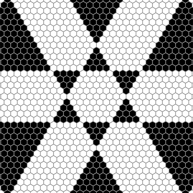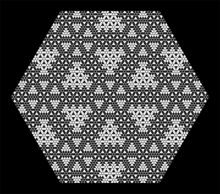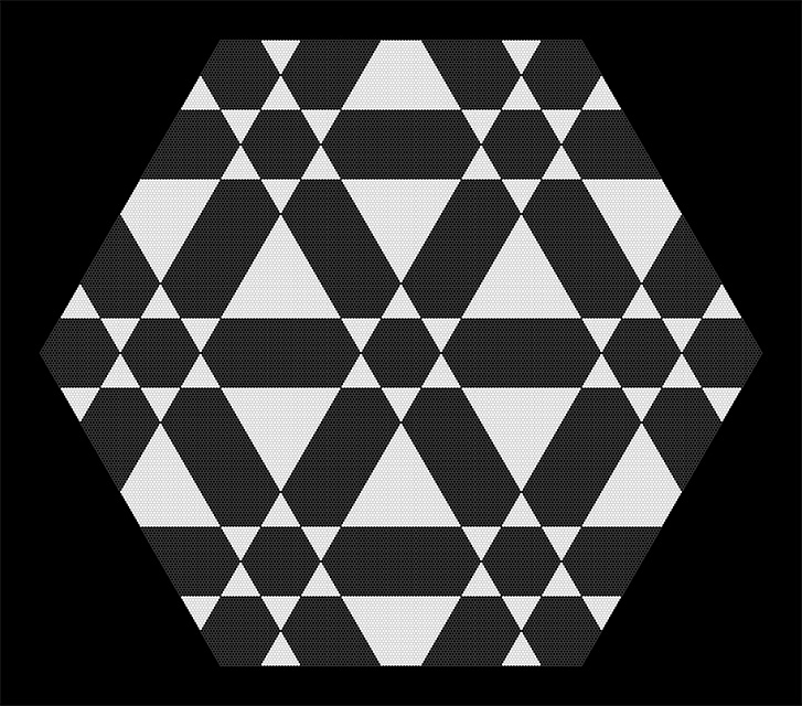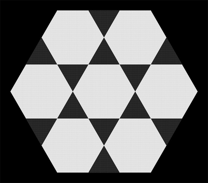 Hexagonal Divisions (Pentaptych) is devoted to an exploration of the hexagonal grid. In the five panels a scheme of successive division of space unfolds, based on hexagonal regions. The first panel is the "zeroth term", showing an empty hexagonal space made up of small black hexagonal cells. In each subsequent panel, white hexagonal regions are overlaid on black areas and black hexagonal regions are overlaid on white areas. The simple internal logic leads to an intricate and evocative visual result.