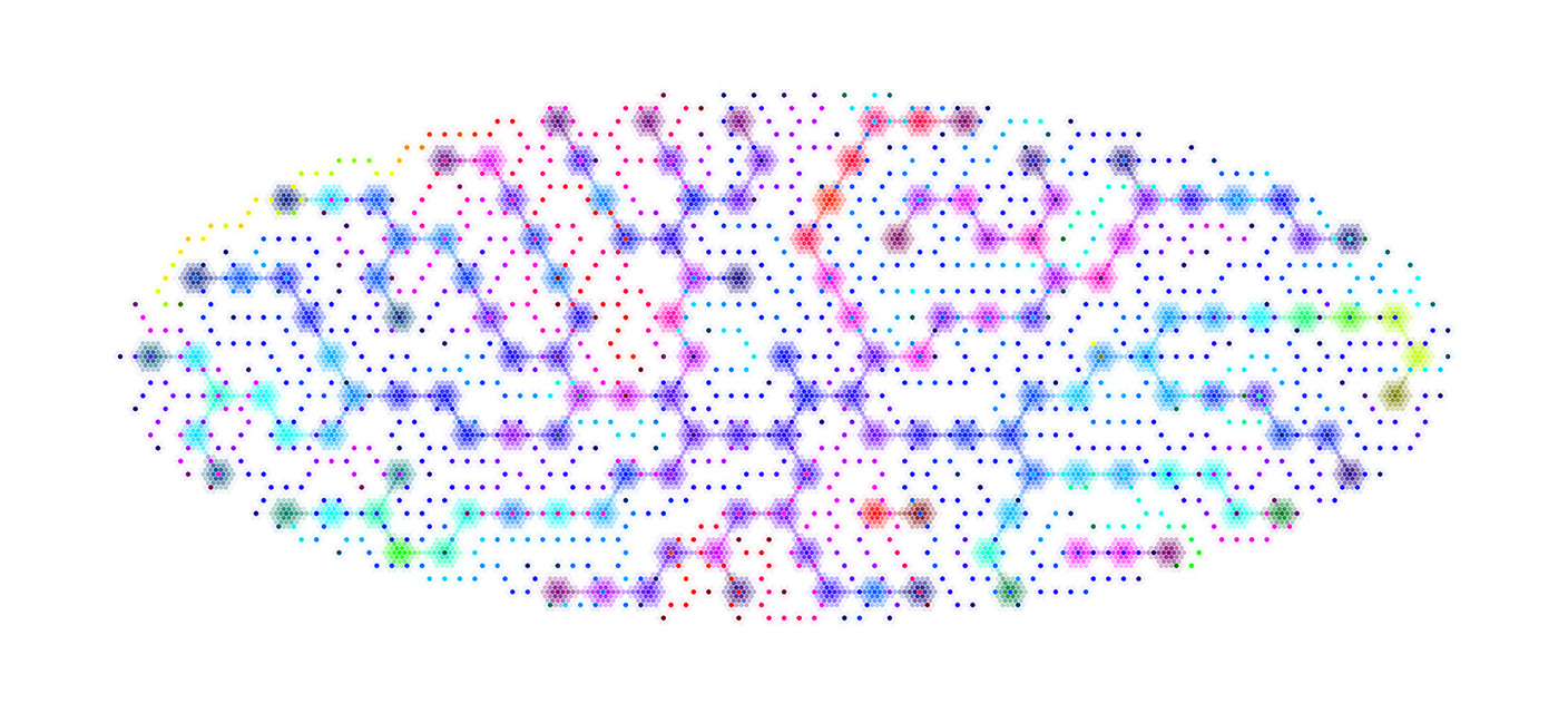 Micro-Crystalline Currents is an image made by a computer program written by the artist. It explores a process of "currents" that carry colour, in the framework of a two-layered hexagonal grid.