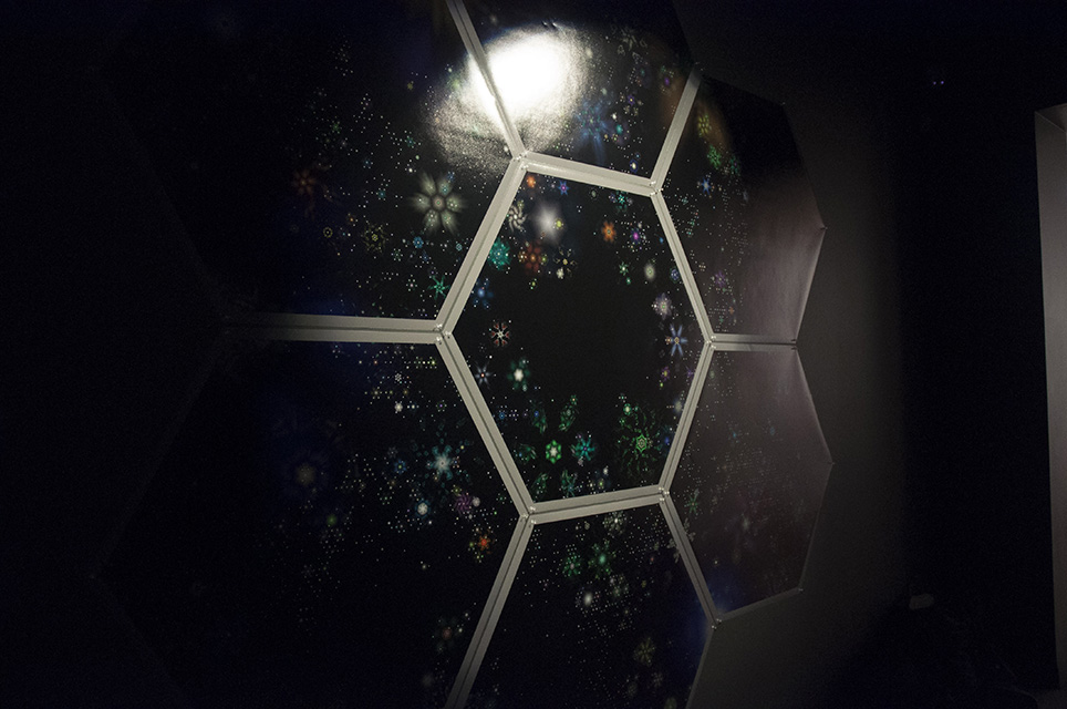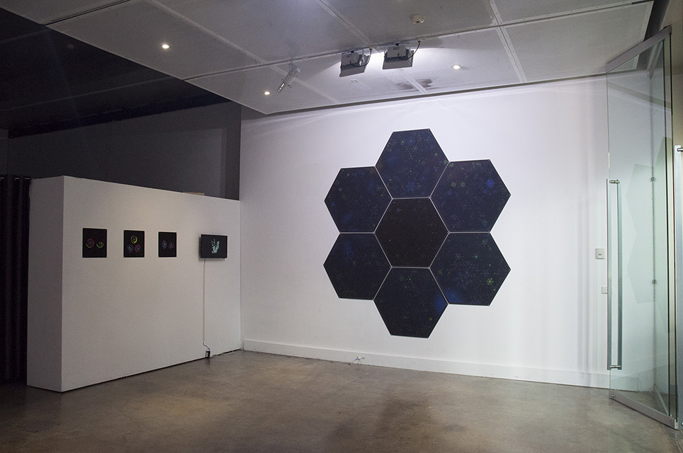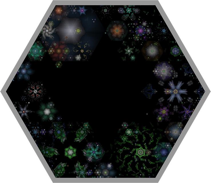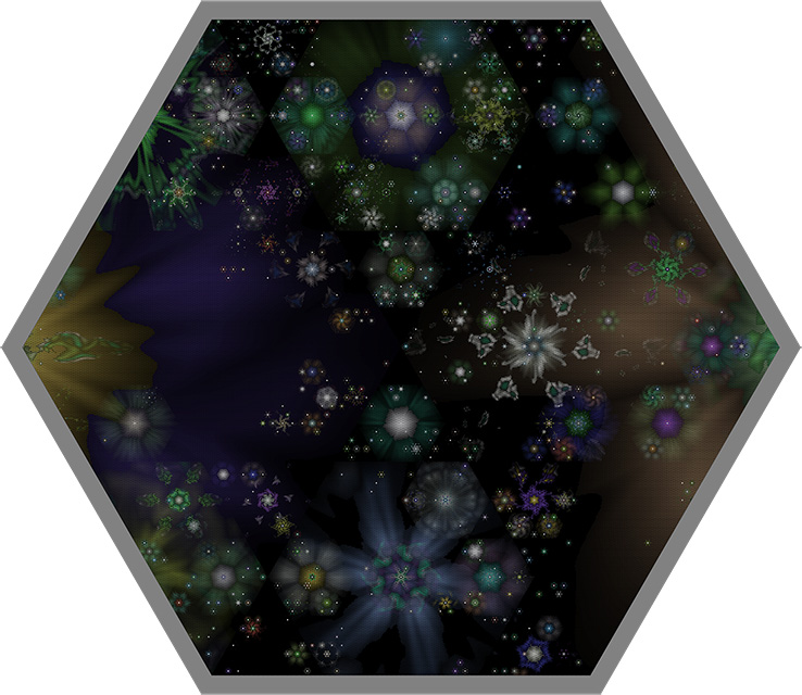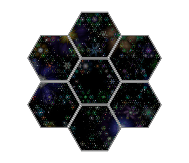Shows a large portion of the world of Nanocosm, fairly late in its evolution of the Nanocosm. Seven hexagonal digital prints, each 100 x 115 cm. The assemblage has size 310 x 290 cm. Edition of 3. Date: 2017.